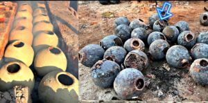 陶器壺に ハリタキ・木炭・硫黄鉱を封入し、約950℃で密閉還元焼成。